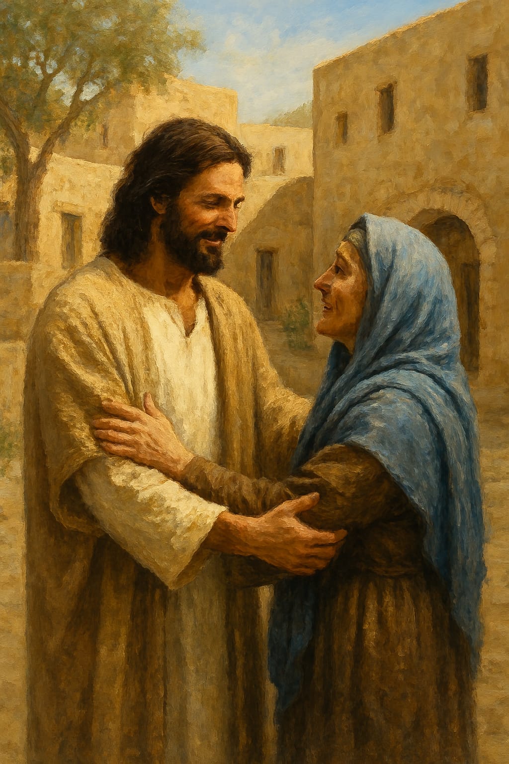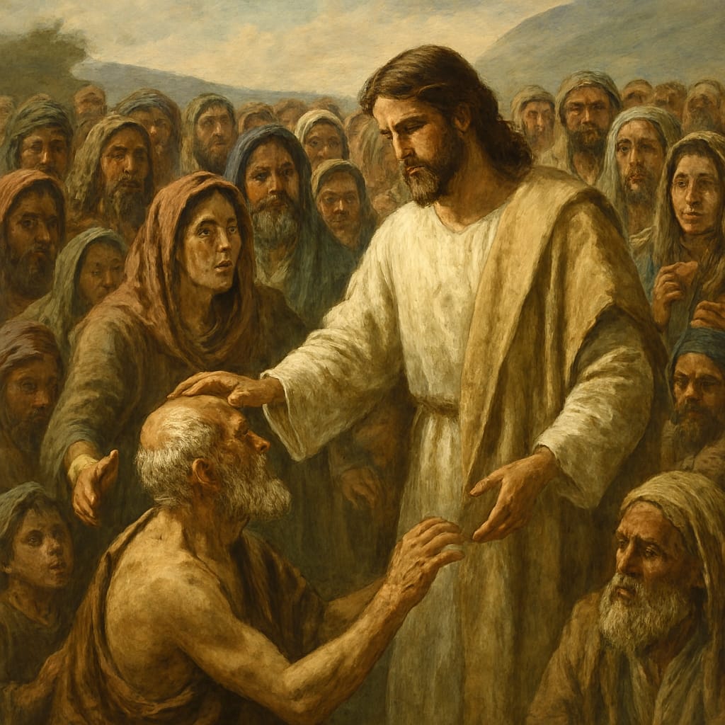 Uma grande multidão, ao ouvir falar de Jesus, das maravilhas que Ele realizava, vai a Seu encontro e lança-se lhe aos pés, de maneira a comprimi-Lo.